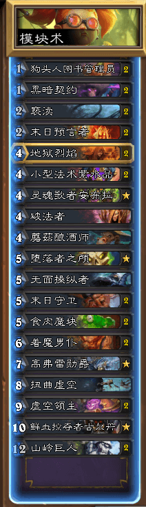 又到了月底了,这个月我已经彻底闲下来了,而最近又刚拔完牙,不能出去约约约,于是在家里打了一阵炉石,最终以75%胜率从5级到传说。目前的环境以治疗园、偶数术、奇数贼、奇数骑、魔块猎、战吼萨为主,最多的就是动物园和偶数术,针对环境我选择了魔块术,顺利冲上了传说。虽然模块术已经是狗头人版本的卡组,这个版本又被削弱,但是对于以上主流卡组均为优势或者均势对局,十分适合在5级到1级之间冲分。