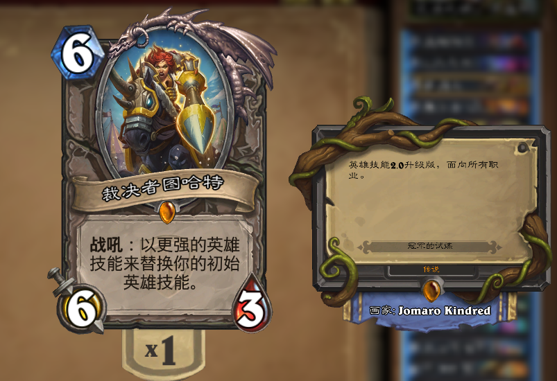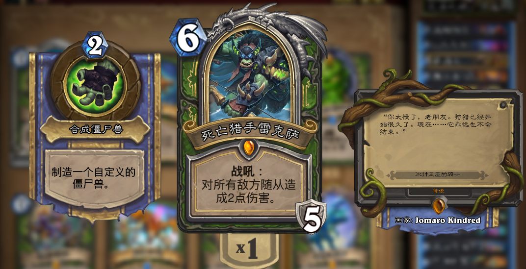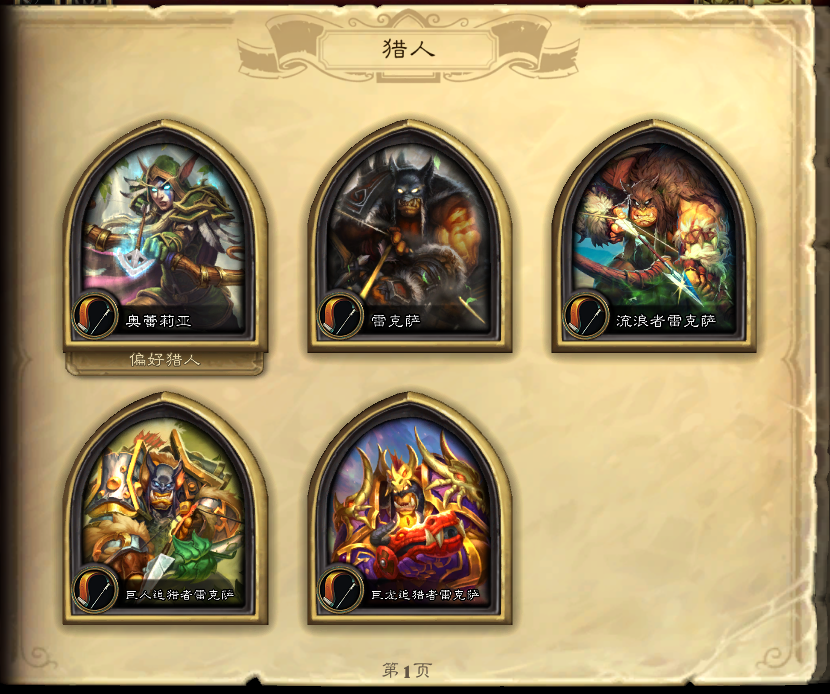 刚入坑的时候因为卡少,只能玩一套T7猎卡组(所谓T7猎,就是在7个回合内将对方打死。7个回合一共有28颗水晶,水晶利用率一般大于1点伤害),因此我花钱买了奥蕾莉亚的皮肤(猎人)。在之后的版本中,我也是非常喜欢使用猎人,特别是在猎人DK英雄卡推出之后,猎人的中速卡组一直是我的最爱,一方面这种按费拍怪赢得胜利的方式让我非常舒服,另一方面,在最早玩T7猎的时候,面对冠军的试炼版本带有图哈特的土豪战(英雄技能增强,战士的效果是2费护甲+4,非常可怕)经常吃瘪,而中速猎非常好打土豪战,5费洛欧塞布6费狮子7费砰砰博士的节奏可以压死他。